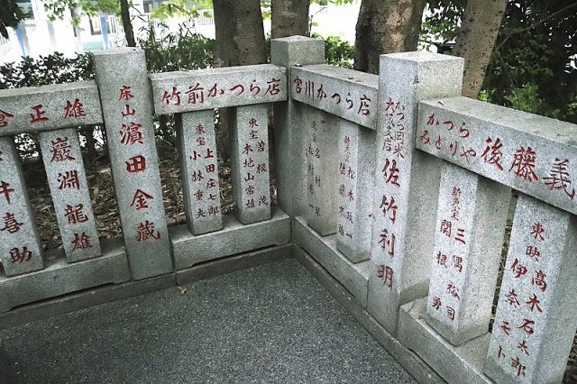 髪の毛にご利益のある神社なので、かつら屋や床山(力士のまげや、役者や人形のかつらを結う職人)など、髪の毛にまつわる職業を営むお店の名前がずらりと並んでいます。
