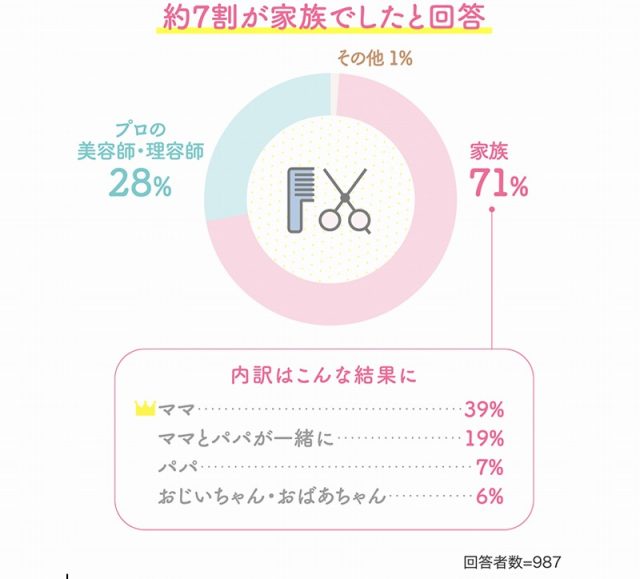 上記のアンケート調査によると、赤ちゃんのファーストカットは保護者の方がセルフで行うことが多いようです。
