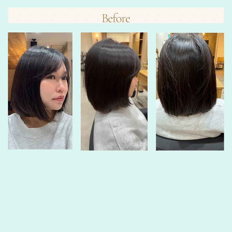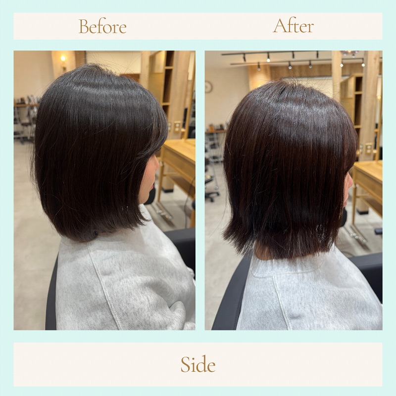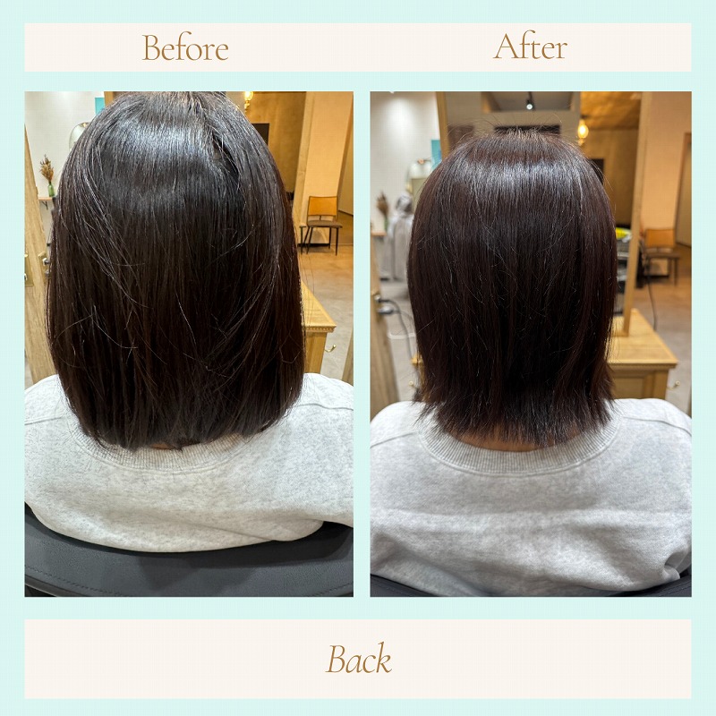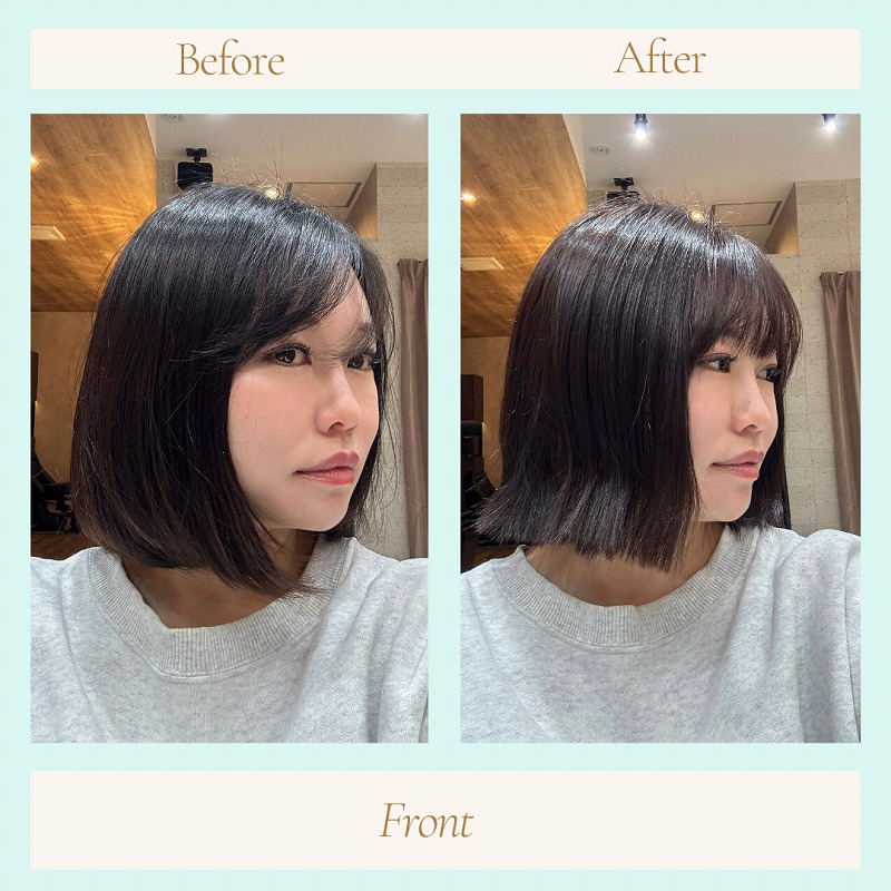 Beforeでは毛先が重く見えていたのが、Afterではツヤ感が出ただけではなくヴァージンヘア独特の重さがなくなり軽やかな印象に。全体的な印象としての雰囲気が柔らかくなりました。