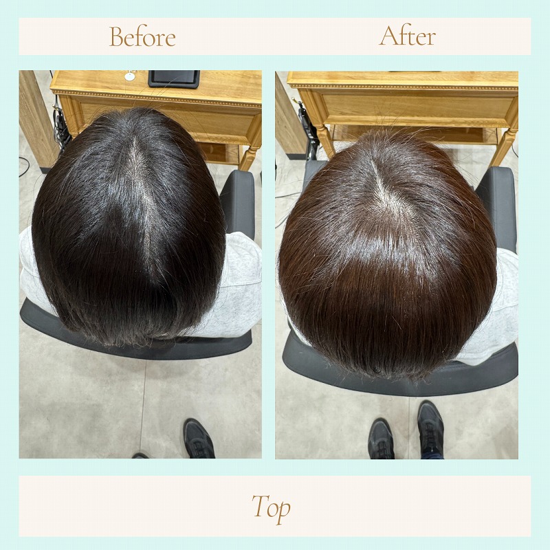 トップはBeforeでは地肌と髪のコントラストが強いためか透け感がやや目立ち、暗さが強調されていました。Afterでは、根元から自然にトーンアップされ、髪の立ち上がりとボリューム感が増した印象に。