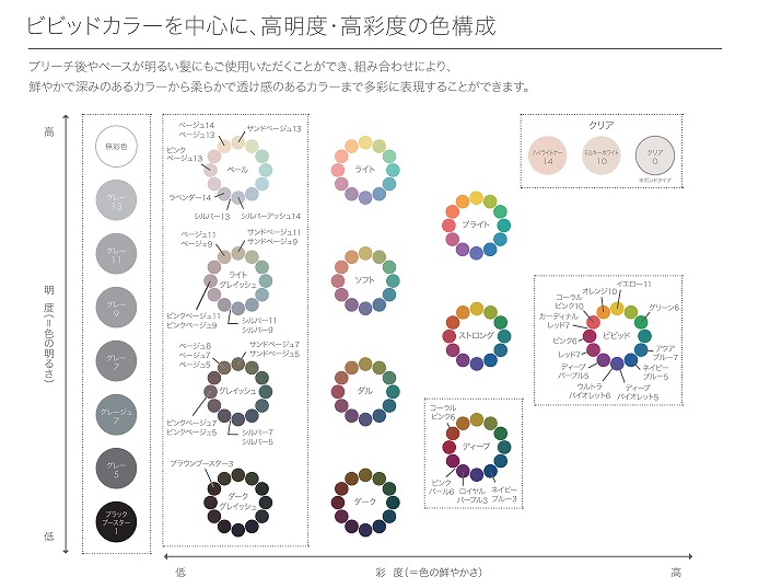 一般的には発色の難しいアッシュ系などの色味はもちろん、ツヤが出やすいピンク系やベージュ系の発色も鮮やか。濁りのないクリアな発色を実現する染料設計はつまり、ツヤ感が出やすく透明感が長続きしやすい処方といえるでしょう。
