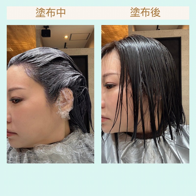 薬剤はややとろみのある質感で、においや刺激感はほとんどなく薬剤の塗布時間も快適。放置時間は私の場合15分で、美容師さんがこまめにチェックしてベストなタイミングで流してくれました。