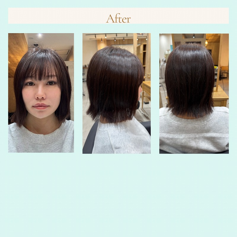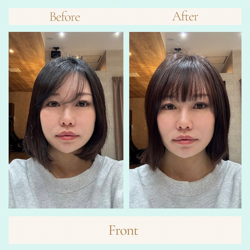 前髪のツヤ感も強調され、光を受けたときの反射が美しく、肌のトーンまで引き立つ印象に変化しました。透明感のあるカラーが、表情を軽やかに見せてくれます。