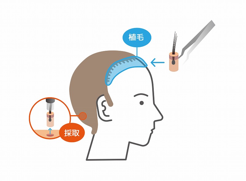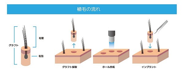 自毛移植は後頭部(ドナー部)から毛包を採取し移植先に小さなホールを作った後グラフト(毛包)を一本ずつ植え込みます。植毛の一連の流れはどの術式でも共通ですが、「採取方法」や「植え込み方法」によって特徴が大きく異なります。
