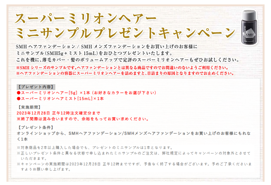 SMHヘアファンデーション・SMHメンズヘアファンデーションをお買い上げのお客様にSMHミニサンプルを1本プレゼント
