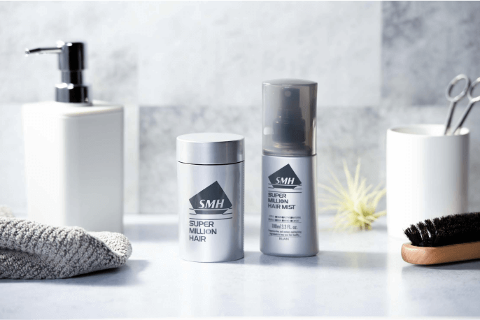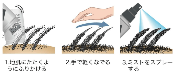 繊維をふりかけた後は、手で軽くなでて、髪に付着した繊維を髪の根元に落とします。最後に必ず固定用のスーパーミリオンヘアミストをスプレーすることで、雨・風・汗にも強くなり、安心してお出