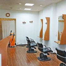 - 『癒しの美空間』を演出。穏やかな曲線を多用した柔らかい空間。タイル貼りの床、手塗りの風合いをだした壁は暖かい空間を演出。店内は全てバリアフリー。ヘアケアに使う水はイオン水とこだわりました。